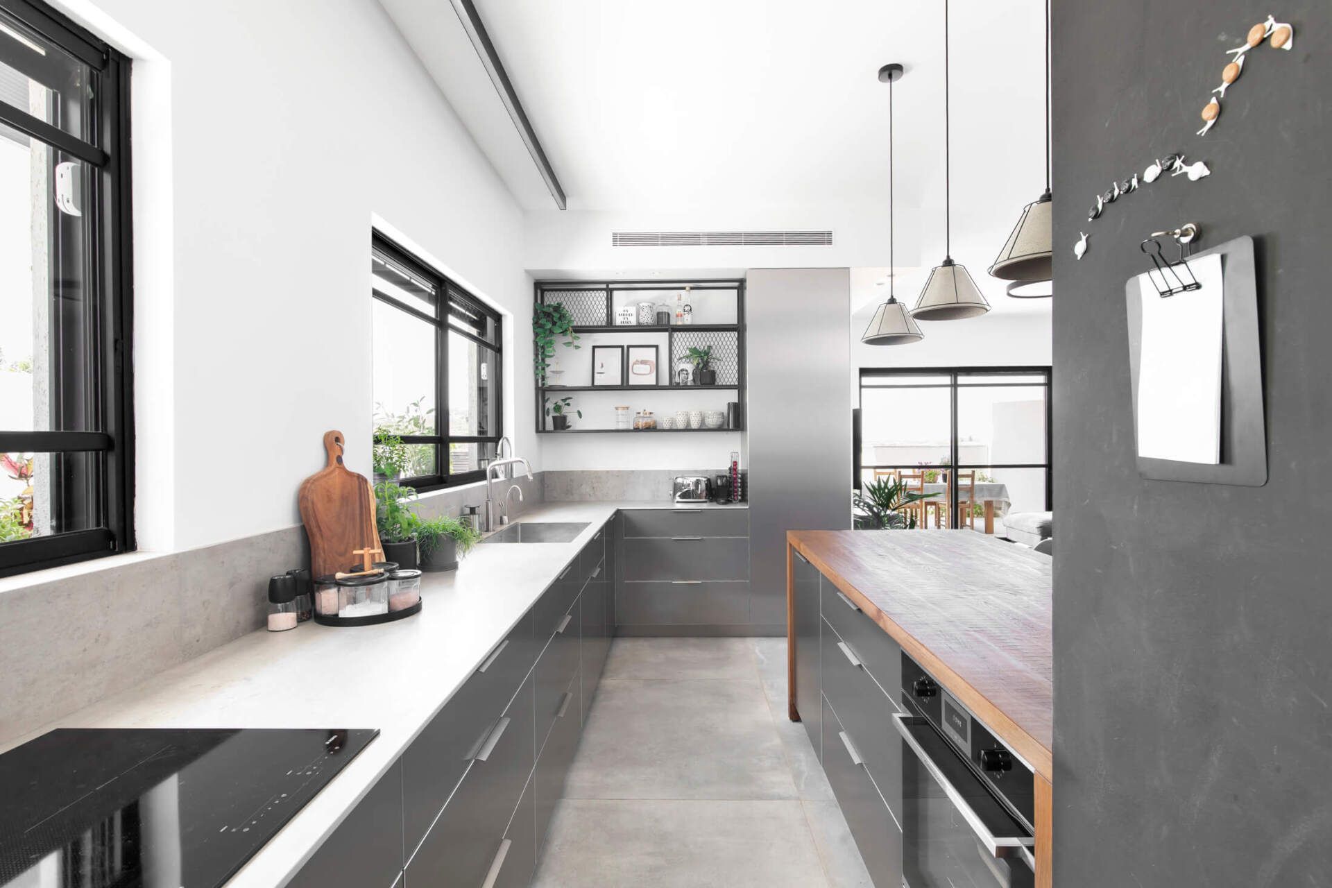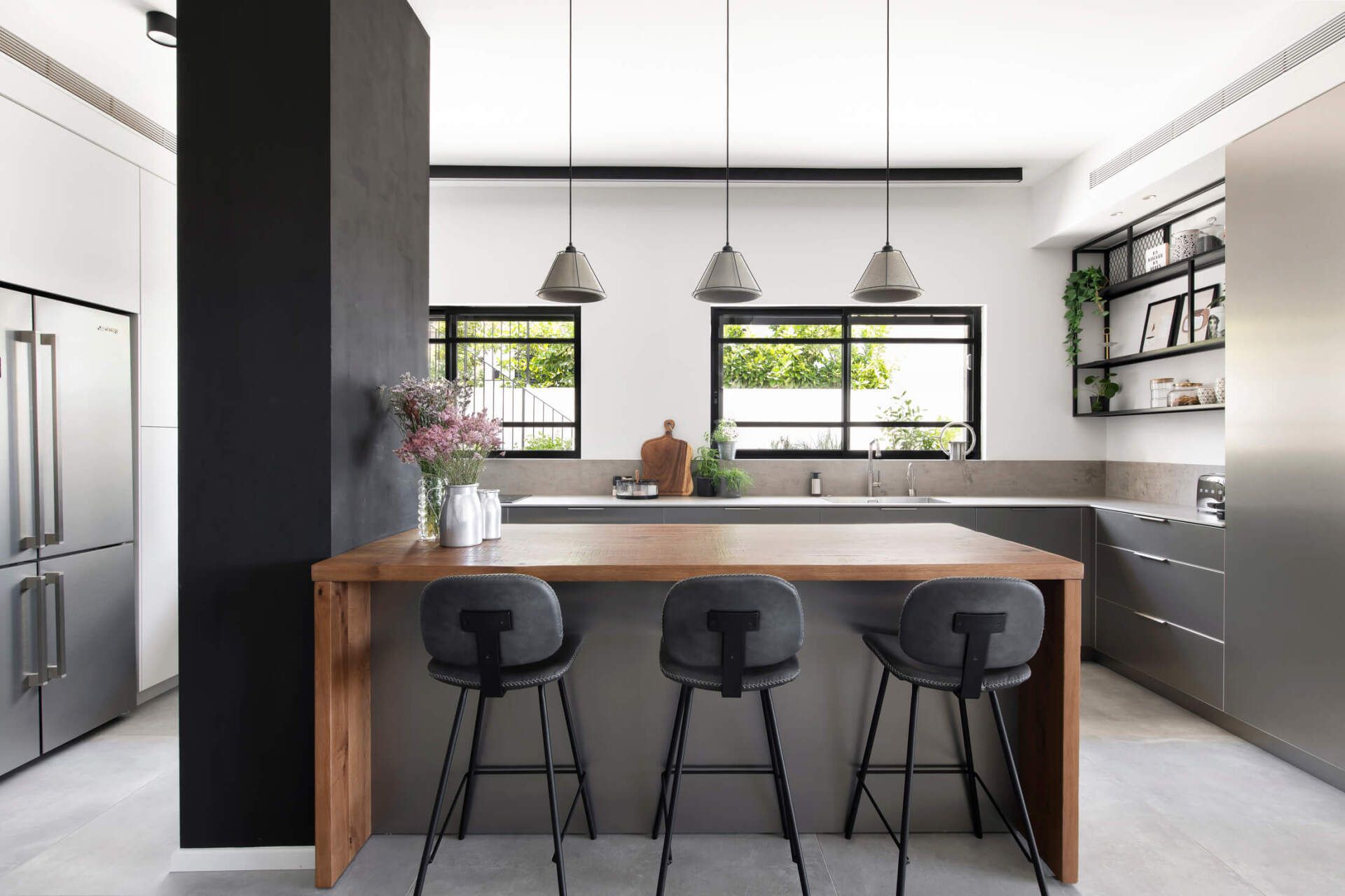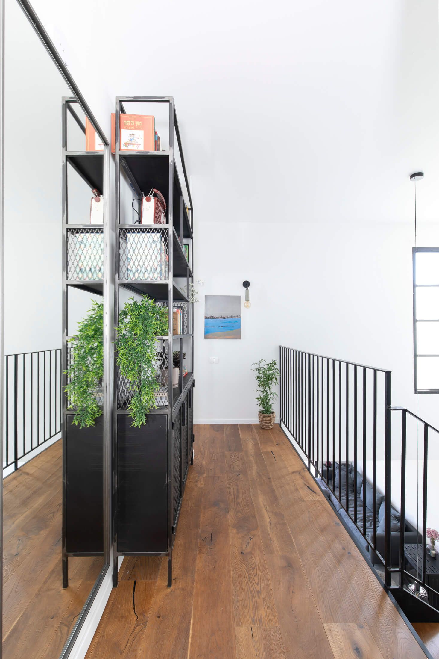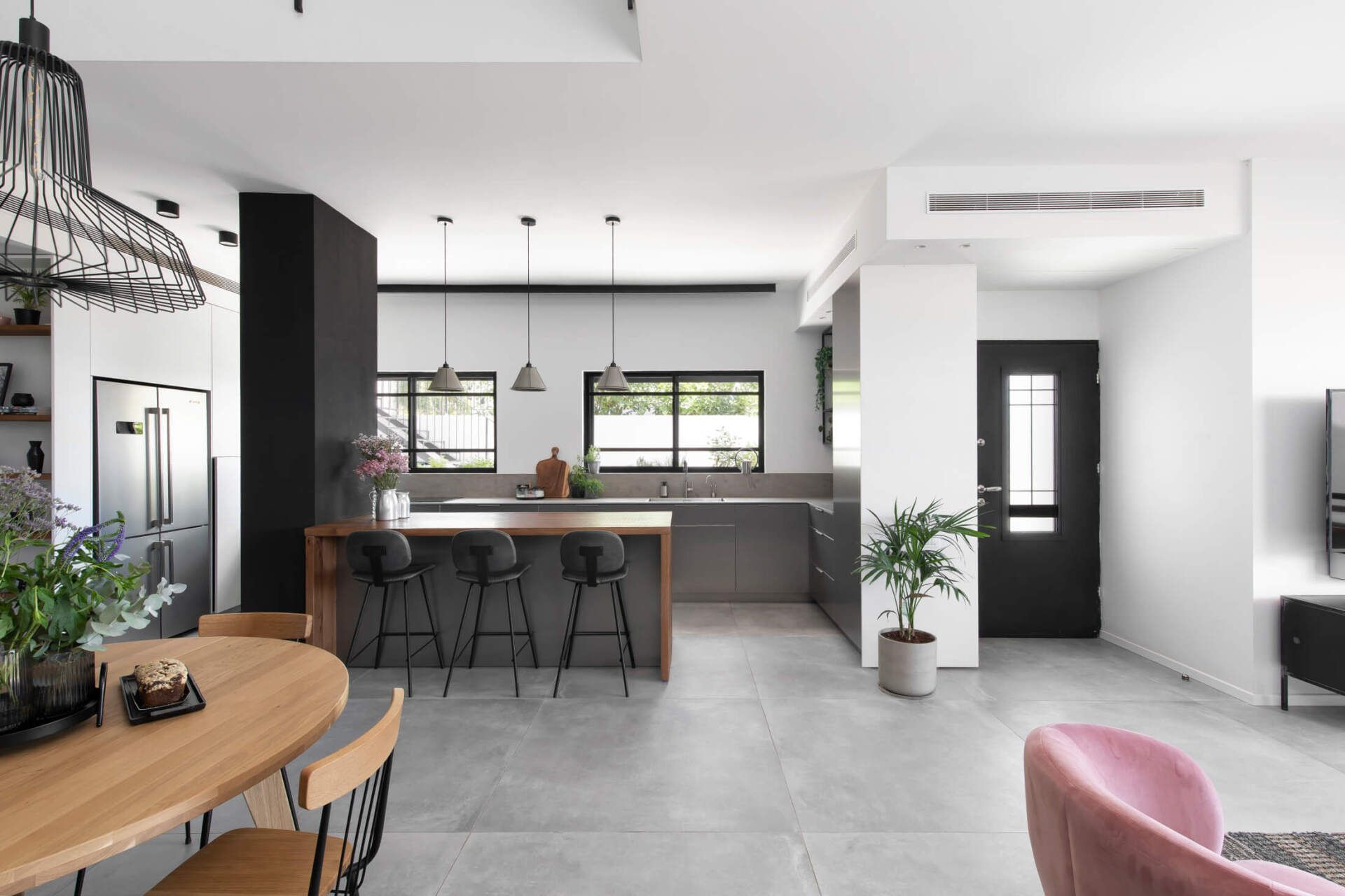 העמוד שקיים במטבח הודגש בצביעה מגנטית שחורה, ויצר אלמנט מרכזי במטבח. חזרה על הנגיעות השחורות נבחרו באלומיניום, ובמדרגות הקלות מברזל העולות לקומת המגורים.