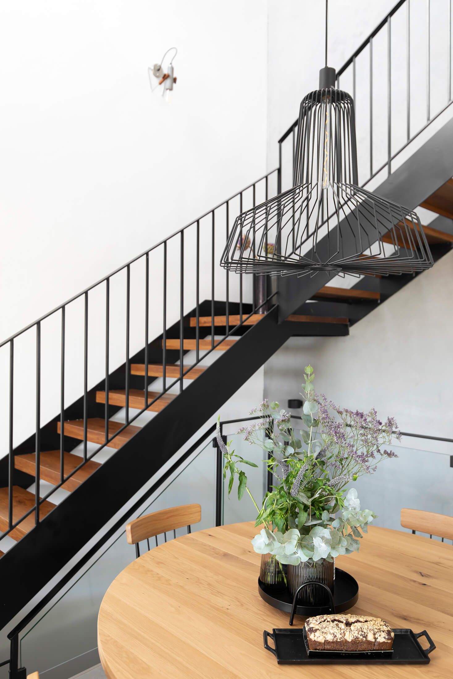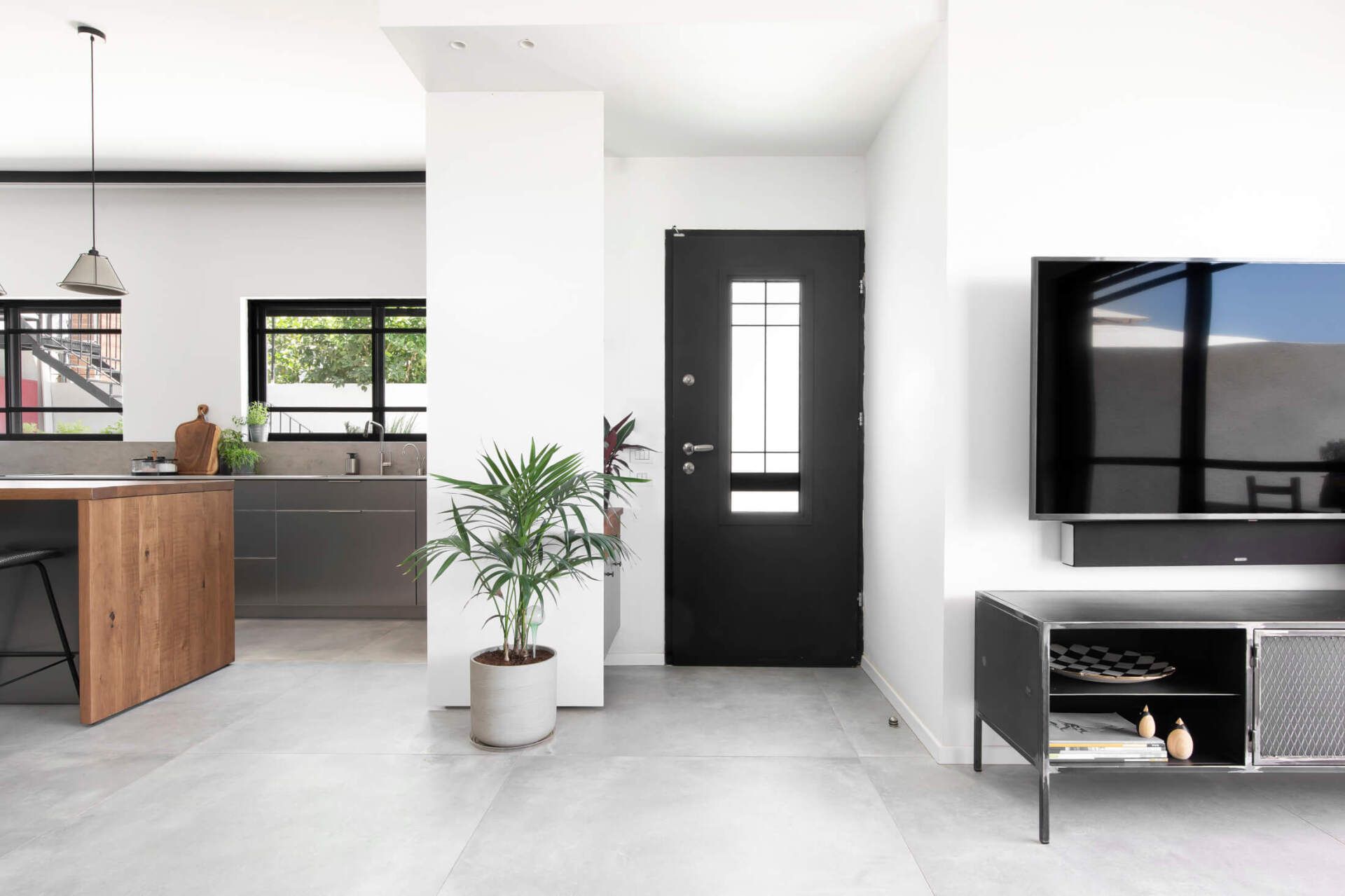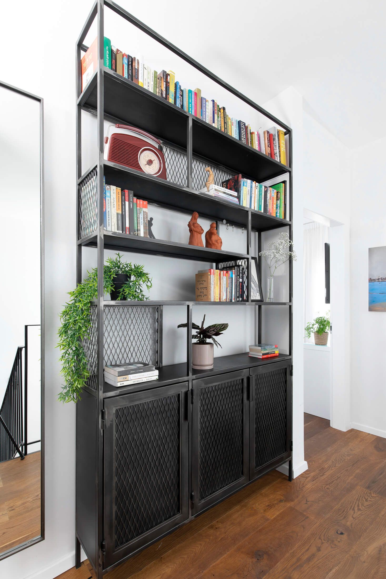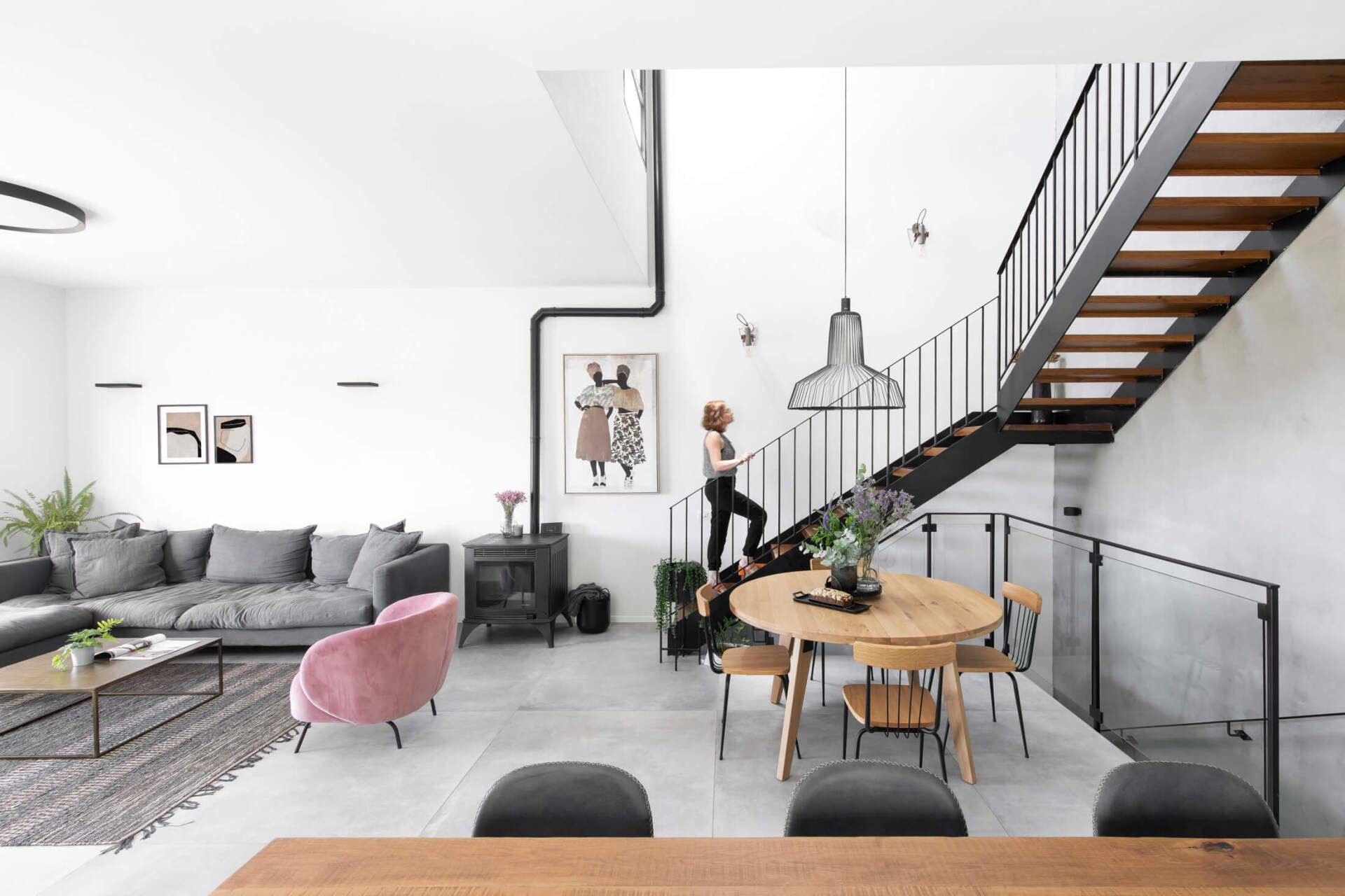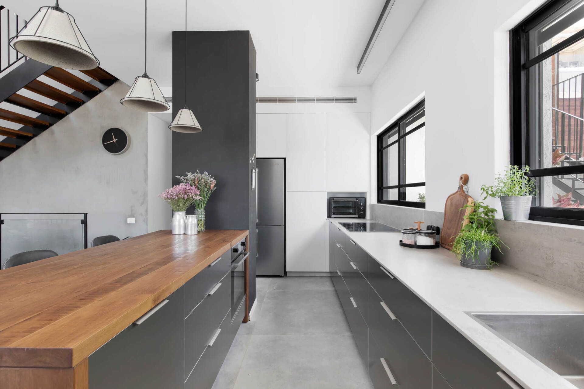 העמוד שקיים במטבח הודגש בצביעה מגנטית שחורה, ויצר אלמנט מרכזי במטבח. חזרה על הנגיעות השחורות נבחרו באלומיניום, ובמדרגות הקלות מברזל העולות לקומת המגורים.