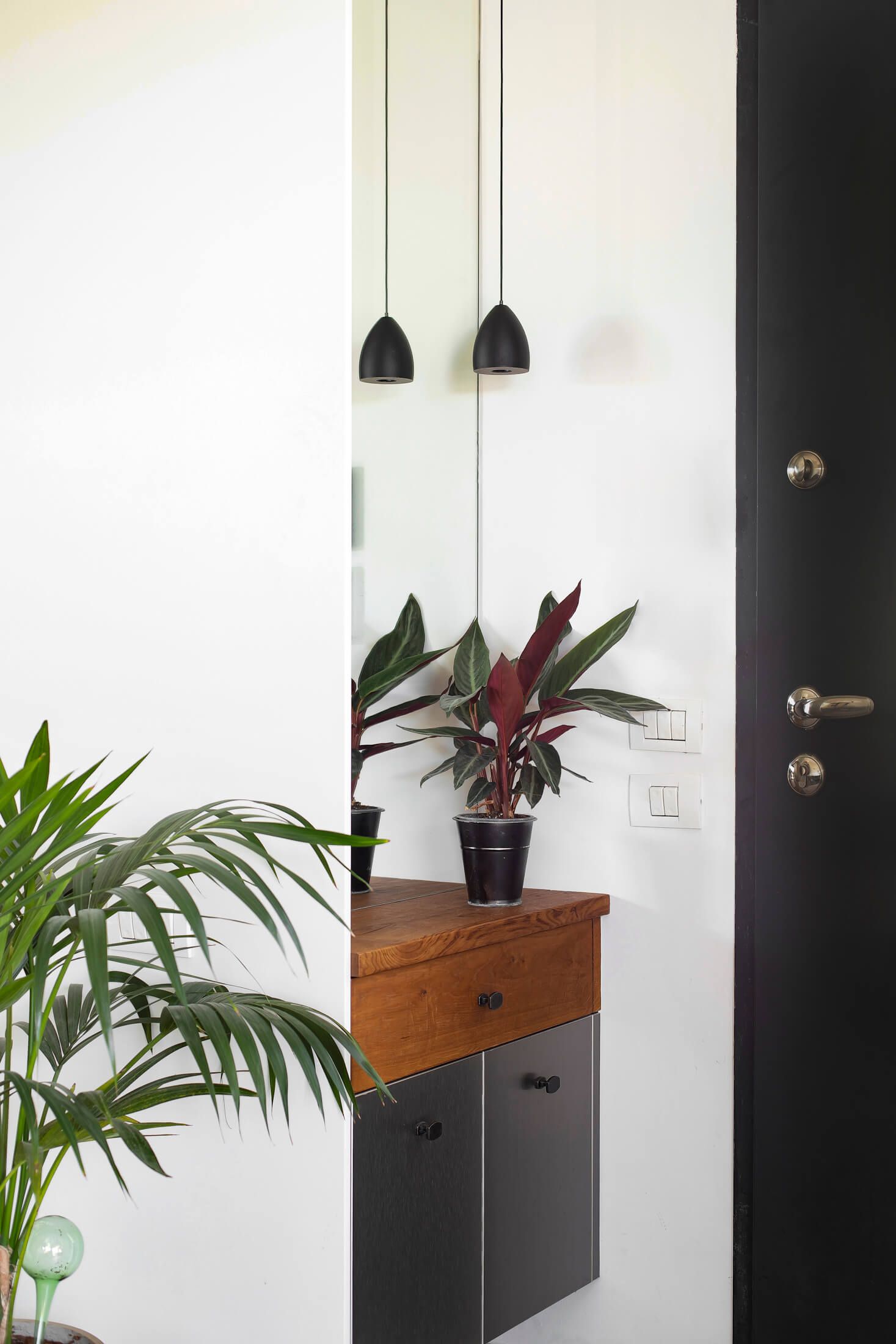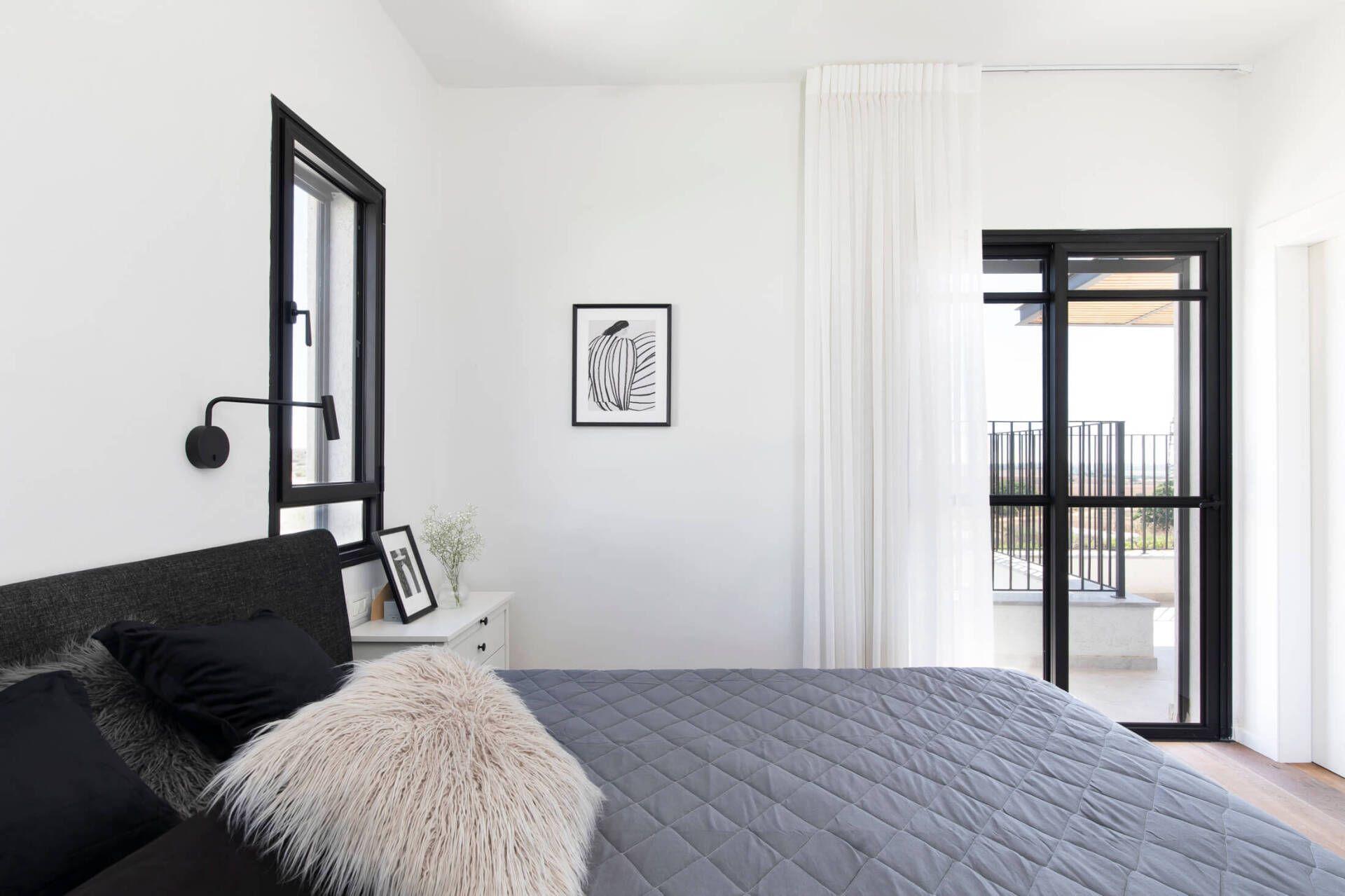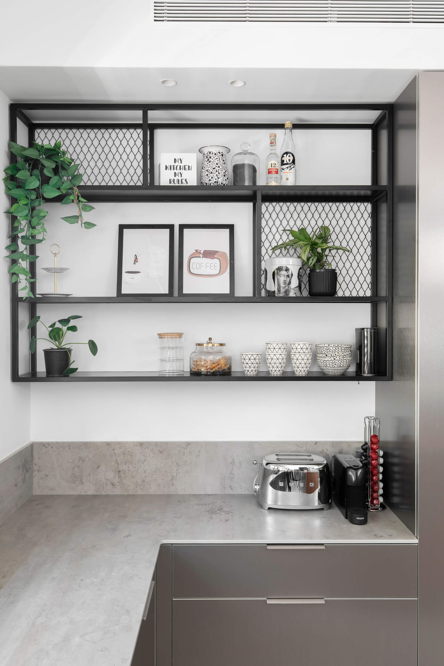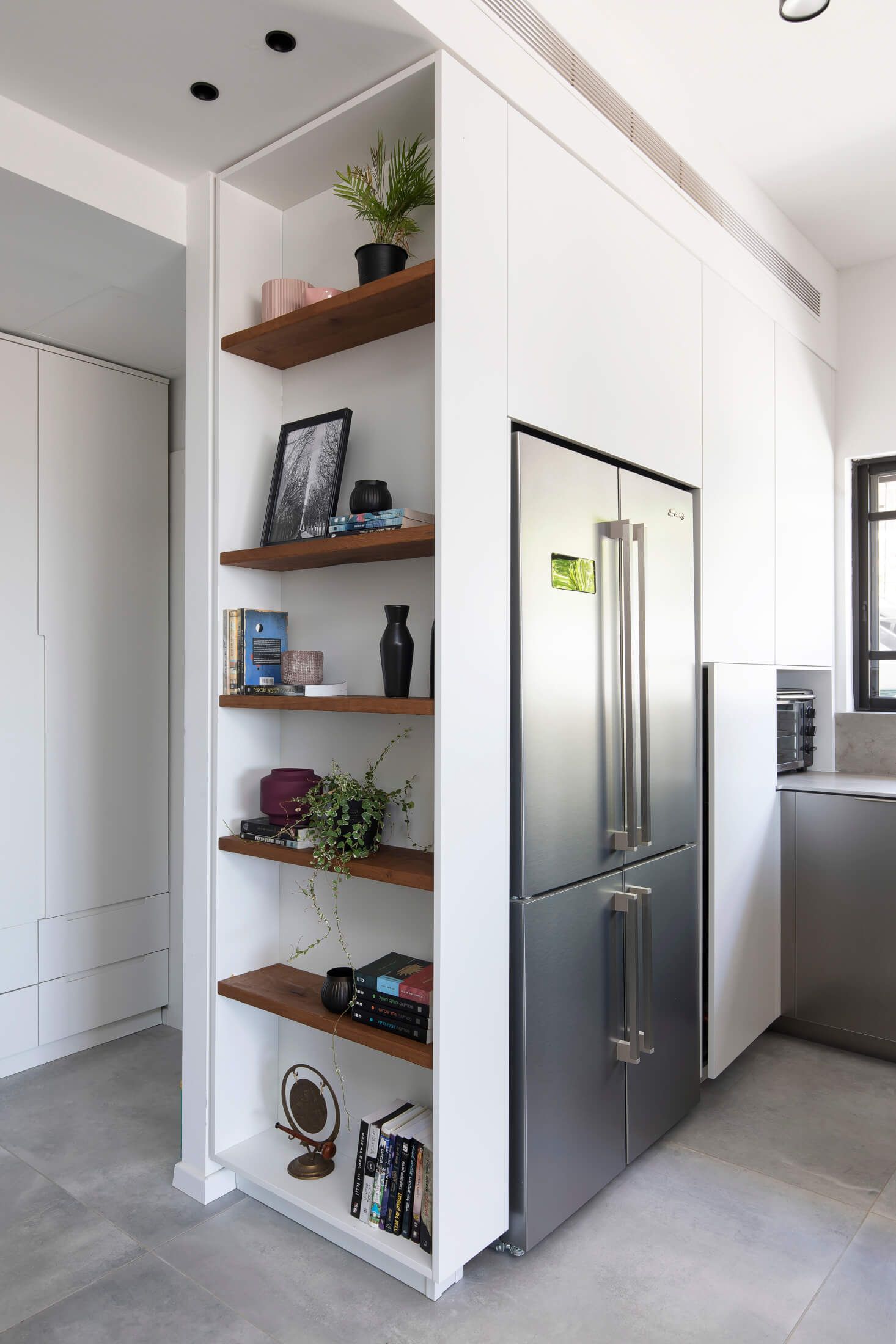 העמוד שקיים במטבח הודגש בצביעה מגנטית שחורה, ויצר אלמנט מרכזי במטבח. חזרה על הנגיעות השחורות נבחרו באלומיניום, ובמדרגות הקלות מברזל העולות לקומת המגורים.