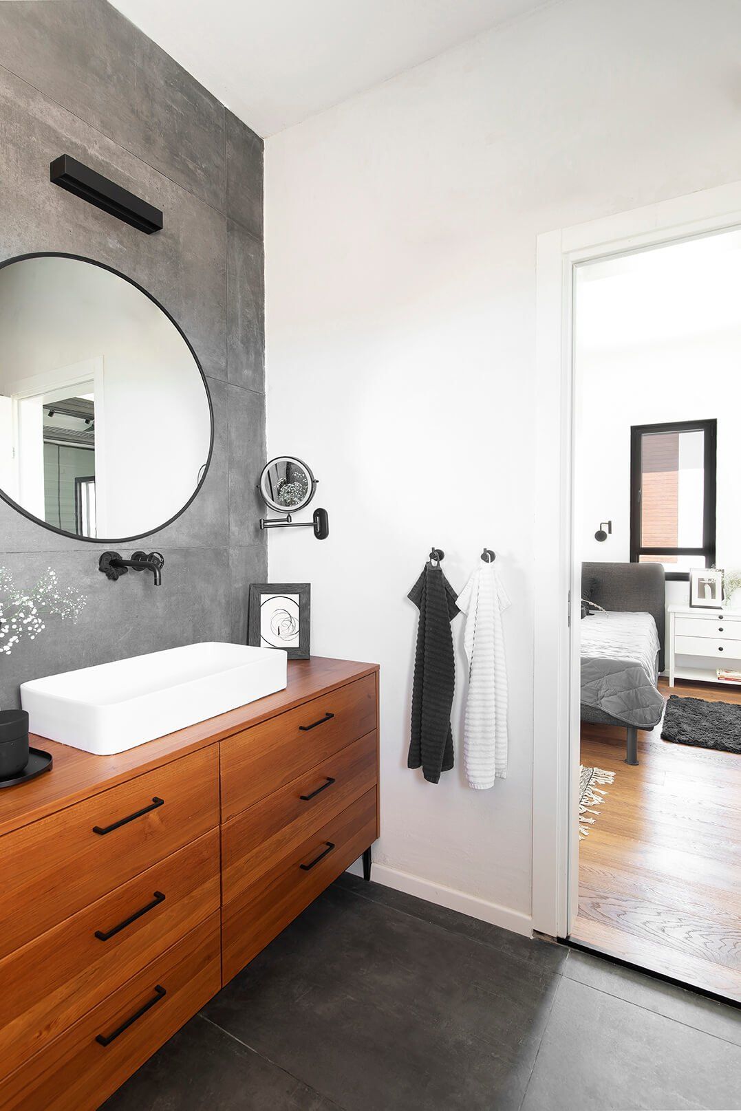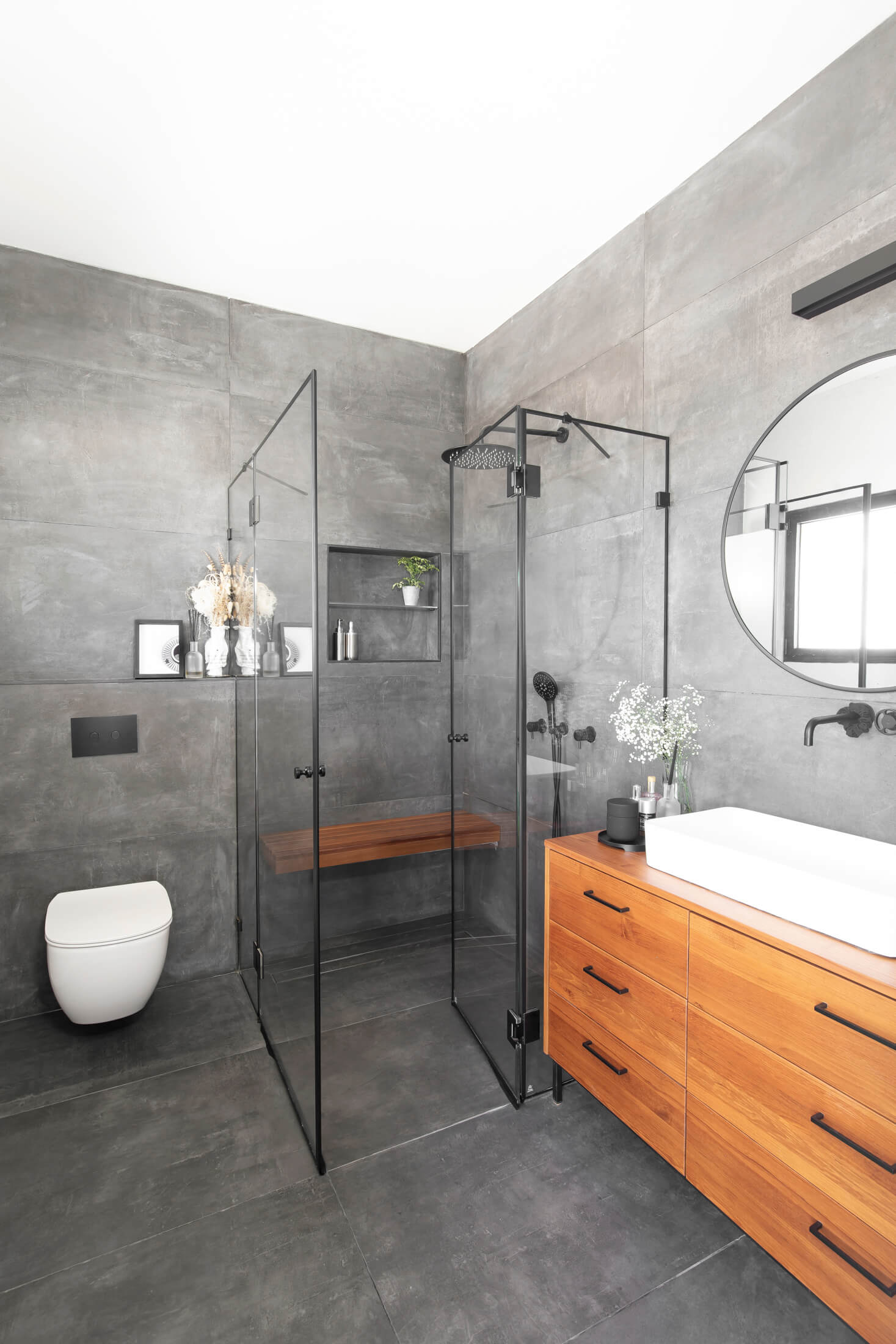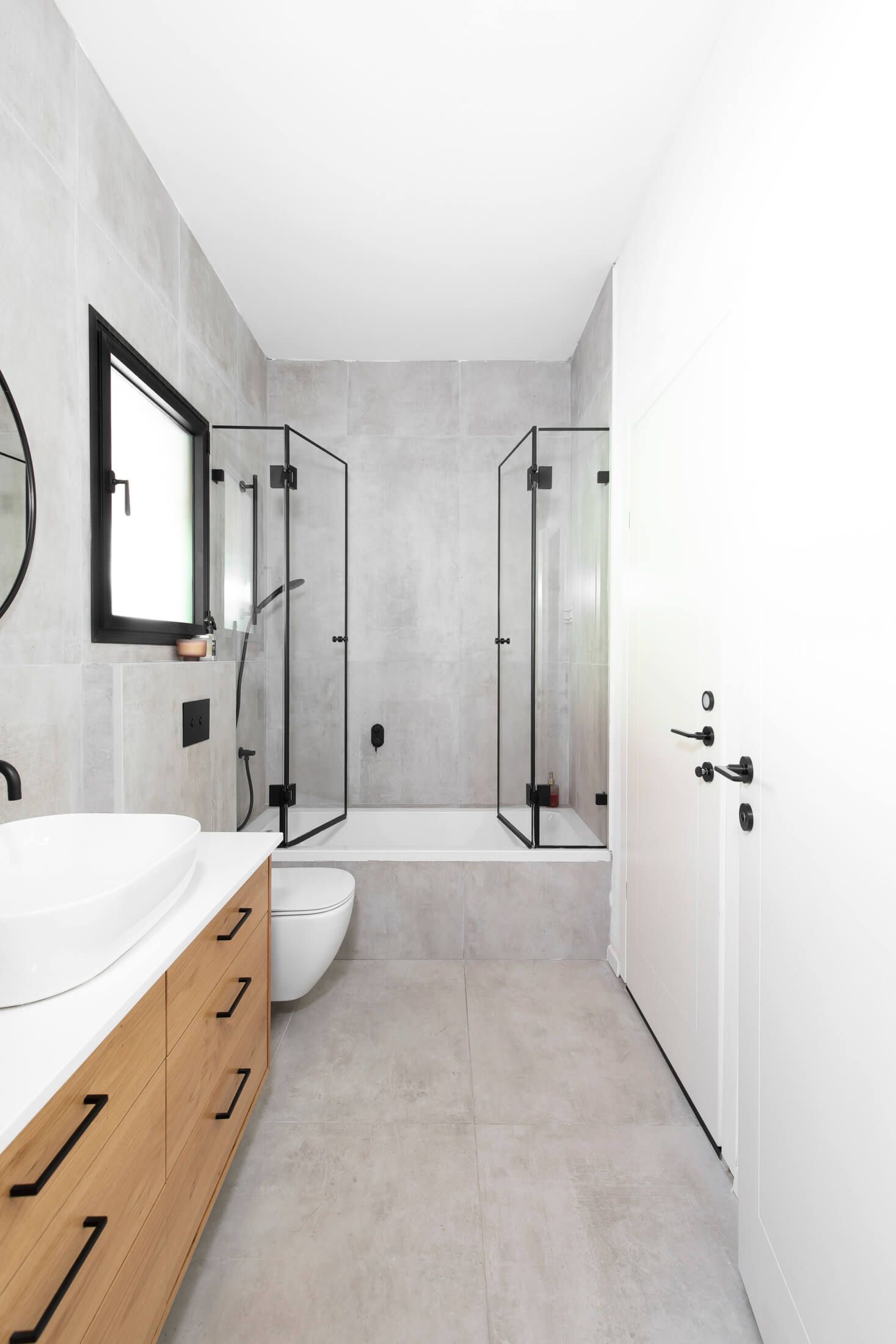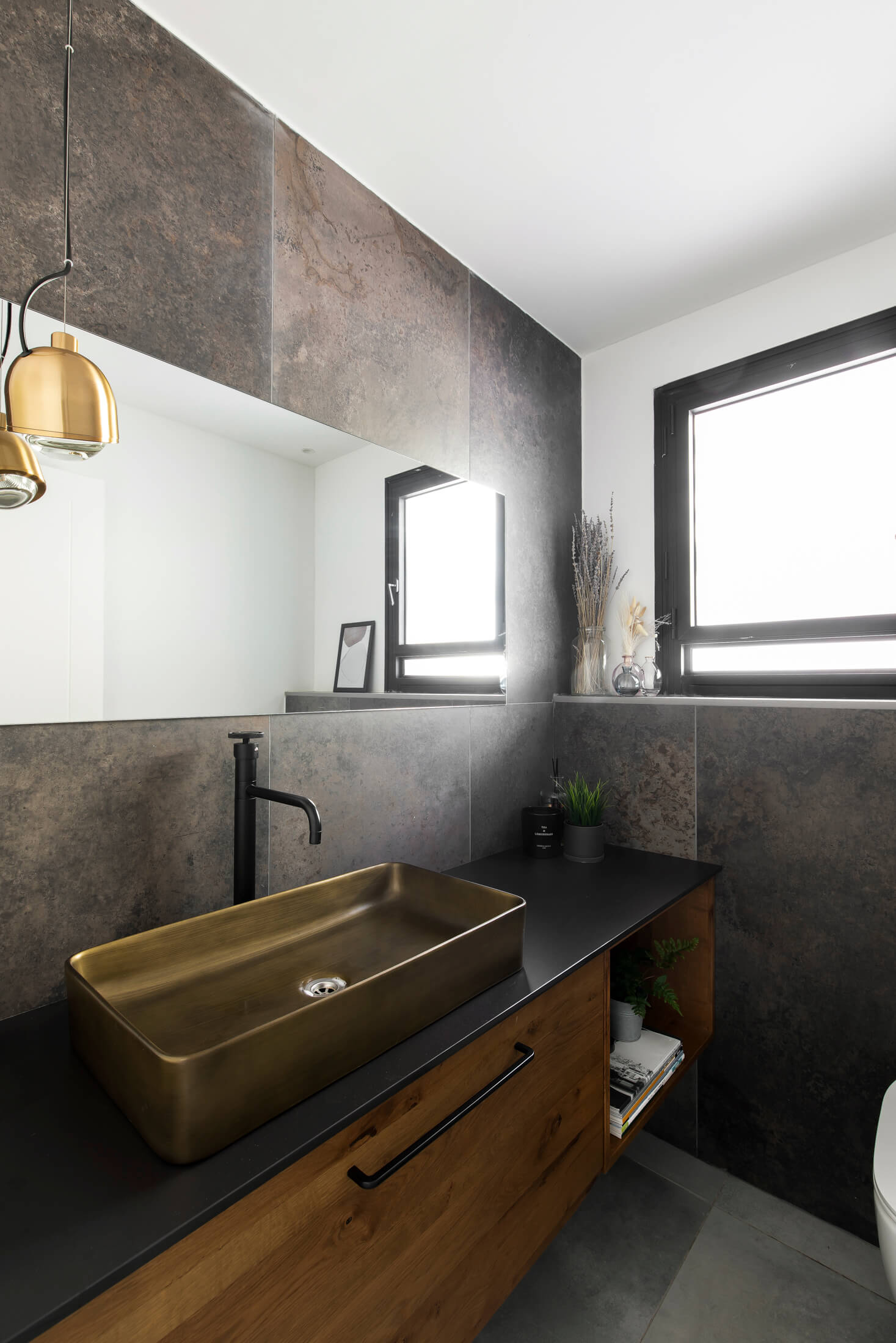 בחדרי הרחצה שולבו אריחים במראה בטון, השומרים על המשכיות באופיו של הבית.