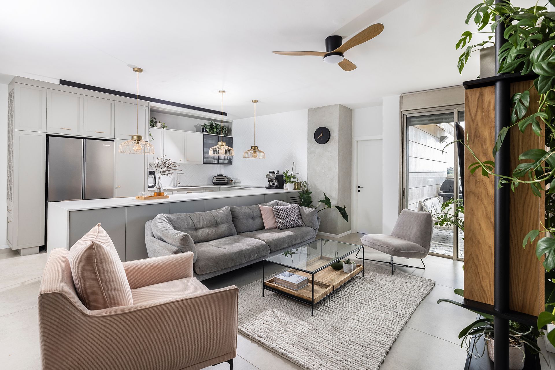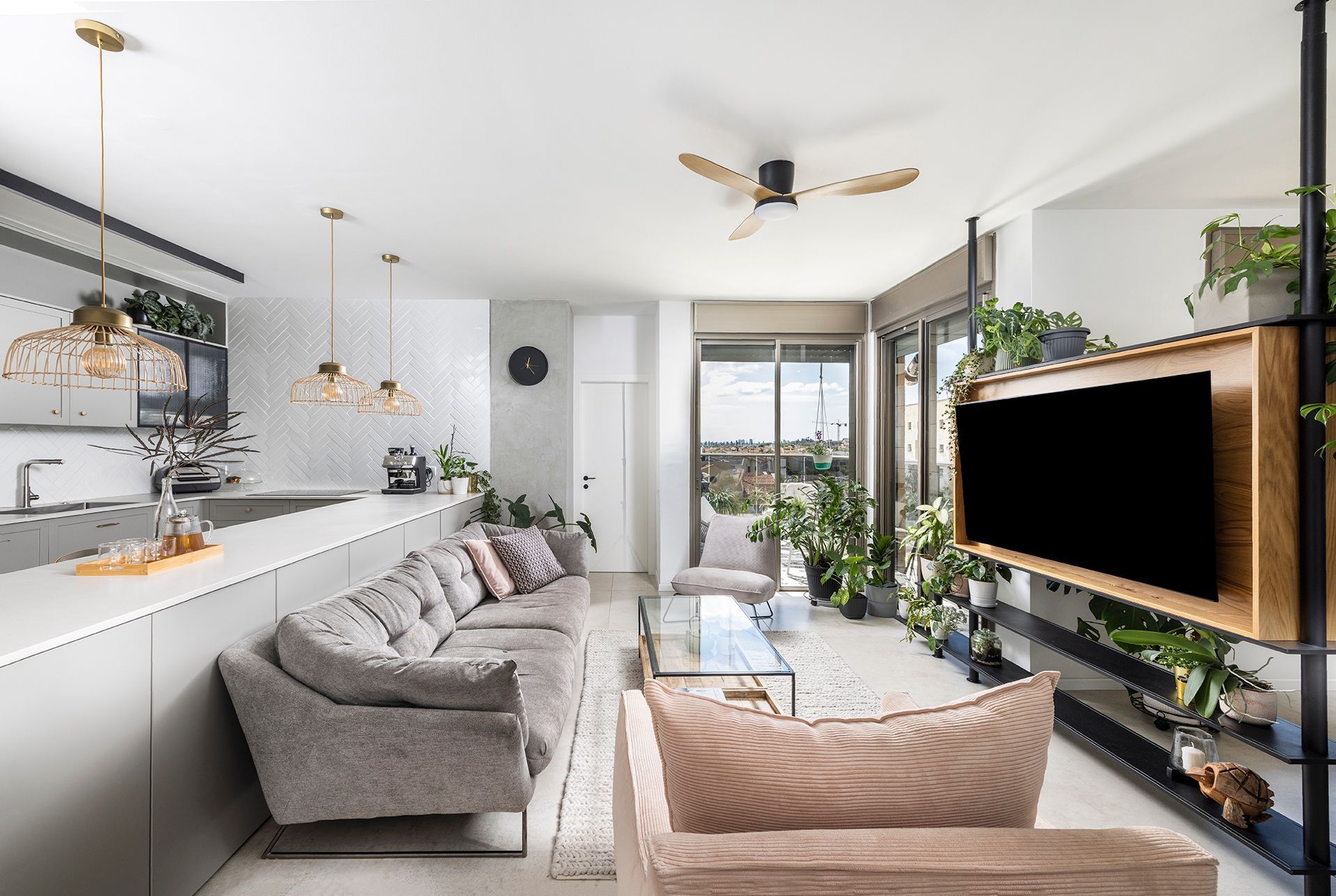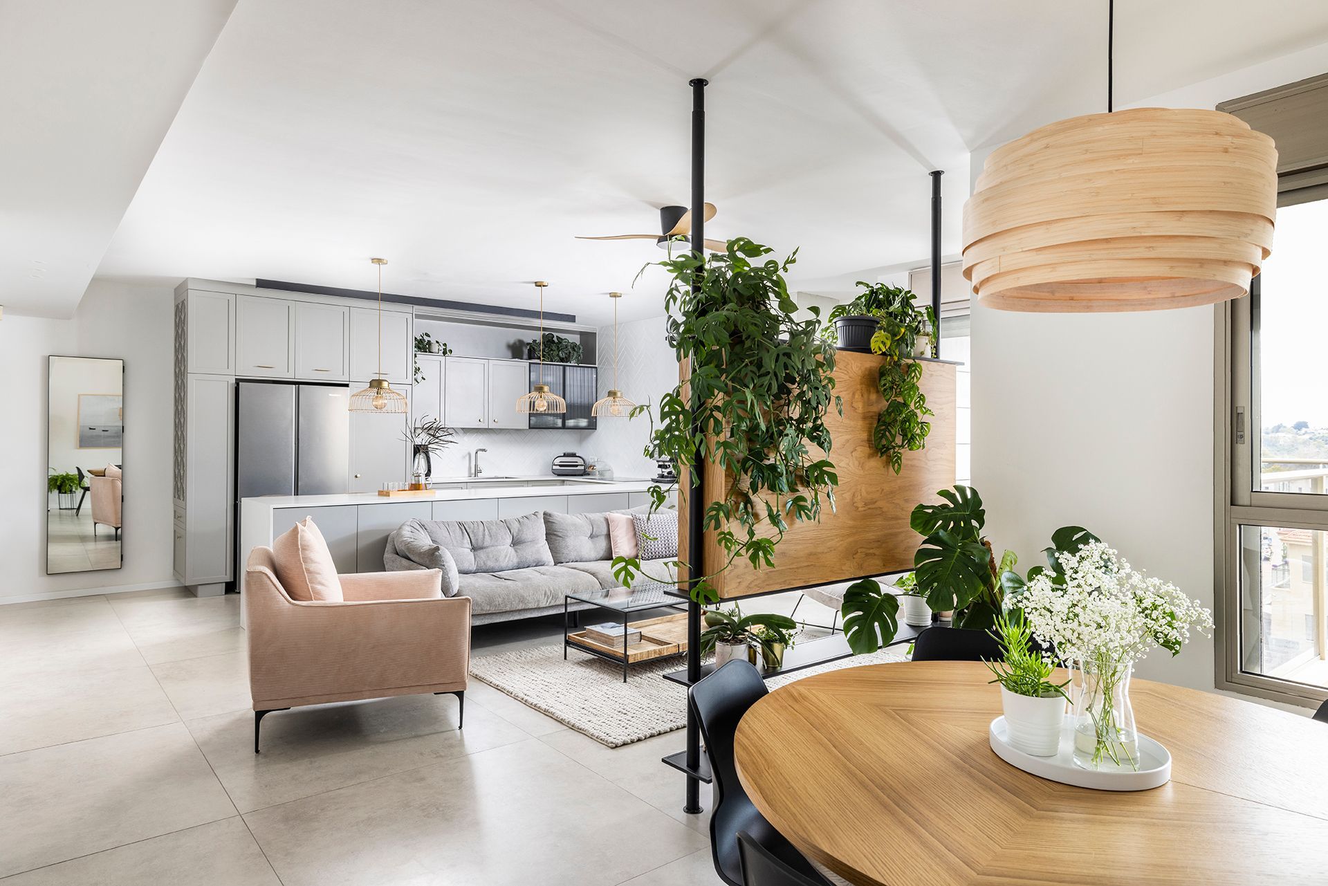 שיפוץ מלא לדירה, שבה המטבח היה קטן וצפוף וכדי להגדילו, בוטל החדר הצמוד לסלון אליו הועברה פינת האוכל, והמטבח עבר לגב הסלון בכניסה לבית. בין הסלון לפינת האוכל תוכננה יחידת ברזל עבור תליית הטלוויזיה ומקום לצמחיה. בחלל המטבח הישן תוכנן חדר לבת הקטנה. חדרי השינה תוכננו באופן מוקפד ומותאם לצרכי כל אחד מבני הבית. בחדר ההורים הוחלף קיר חדר הרחצה במחיצת זכוכית המגדילה את החלל ומאפשרת כניסת אור טבעי לחדר. חדרי הבנות שופצו, ותוכננו עם נגרות מותאמת ובאווירה בוגרת, התואמת לגילן. הדגש הראשוני של בעלי הבית, היה לייצר מקום עבור צמחיה, שכל כך אהובה עליהם בבית, ולכן הושם דגש למצוא פתרונות מוארים עבור גדול הצמחים.