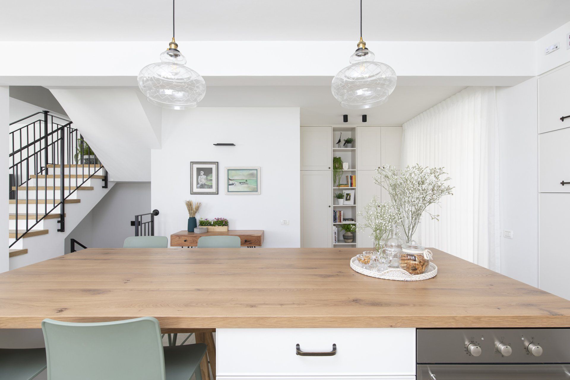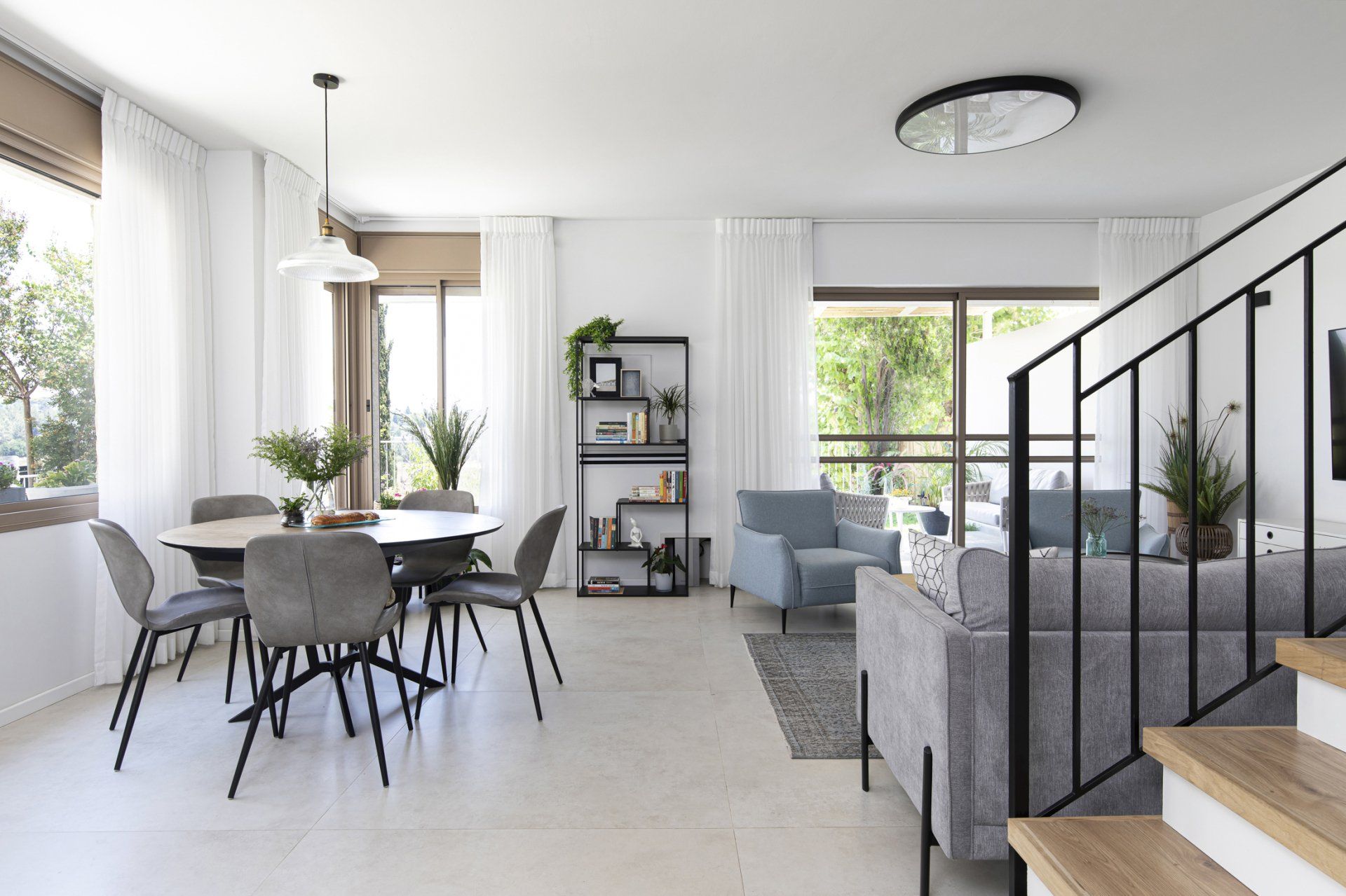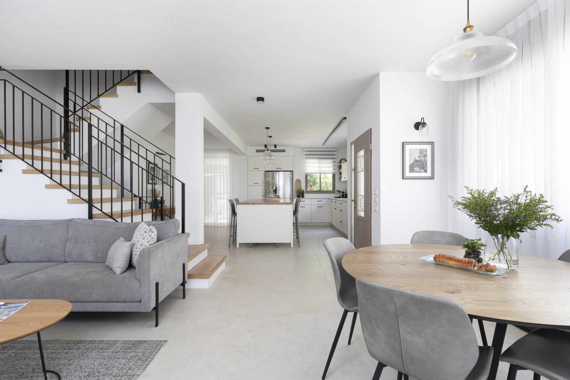 שיפוץ מלא לבית במודיעין. במקור, החלל הציבורי היה צפוף וסגור, כאשר בצמוד למטבח קיים ממ"ד ובין המטבח לסלון קיים גרם מדרגות. הממ"ד פורק ונבנה ממ"ד חלופי במרתף, וגרם המדרגות הפך קליל יותר ע"י החלפת מעקה בנוי במעקה קל - דבר שיצר חיבור בין אזור המטבח לחלל האירוח. הבית מוקף חצר והחיבור בין החללים מאפשר צפייה רחבה יותר לחצר. תוכנן מטבח רחב ידיים עם אי מרכזי שממנו יציאה לחצר האחורית. אופיו של הבית ניכר בקווים נקיים, בצבעים רכים ובעיצוב כפרי התואם את מיקומו ואופיים של בעלי הבית.